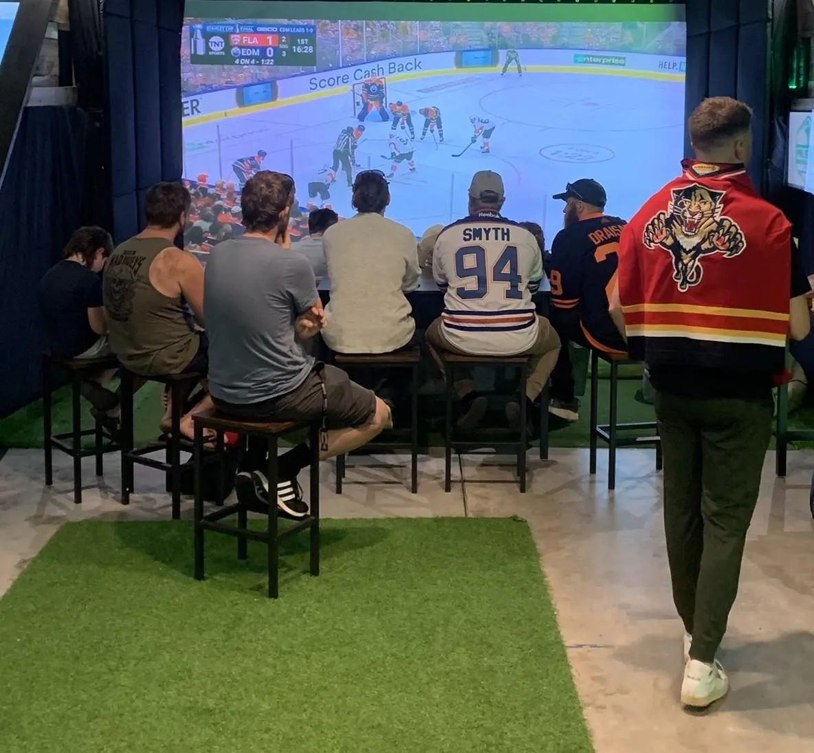The large screen gives an immersive view so everyone sees the action clearly while the bar stays nearby for easy service and optional food delivery to your booth.